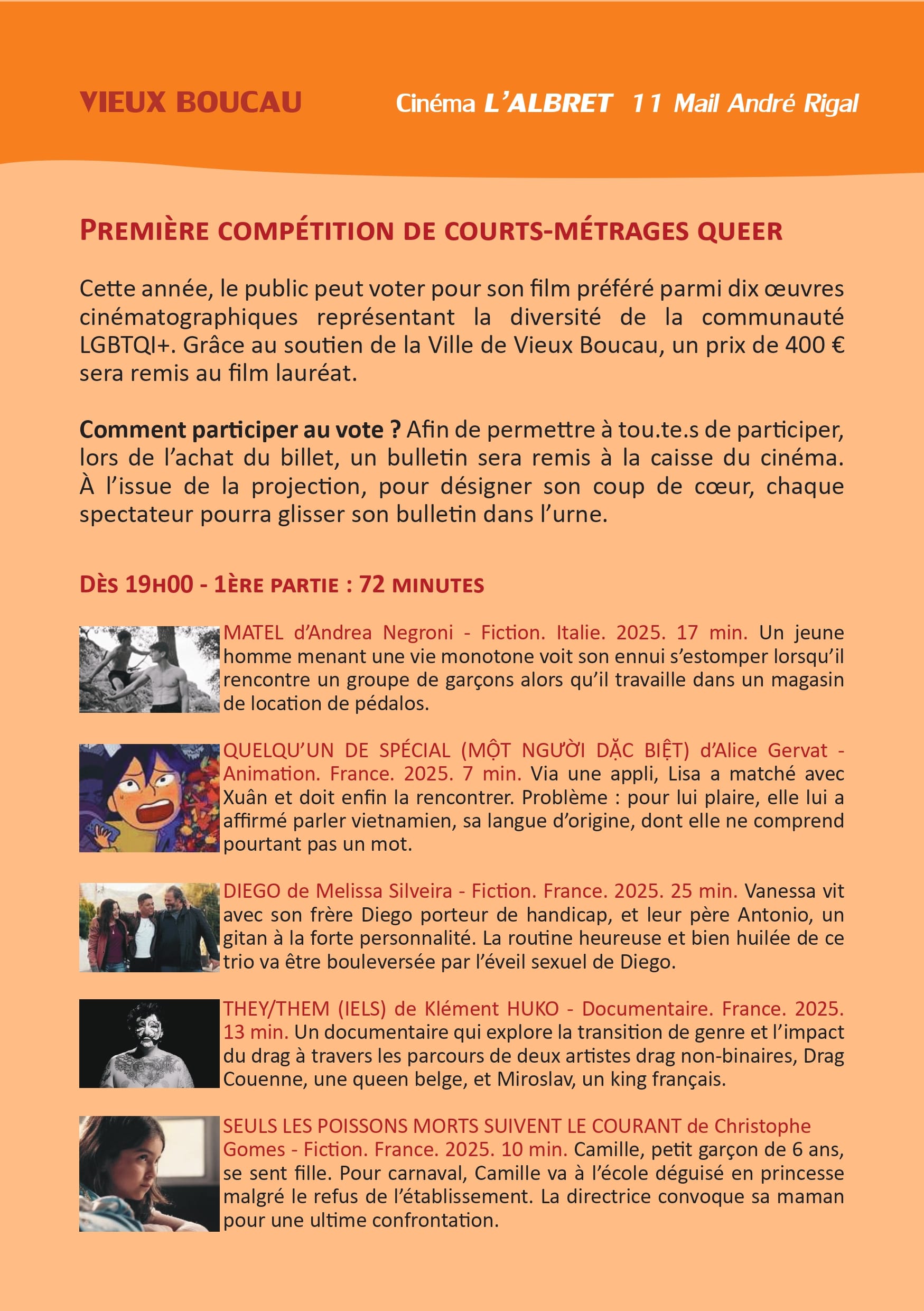 Cette année, le public peut voter pour son film préféré parmi dix œuvres cinématographiques représentant la diversité de la communauté LGBTQI+. Grâce au soutien de la Ville de Vieux Boucau, un prix de 400 € sera remis au film lauréat.