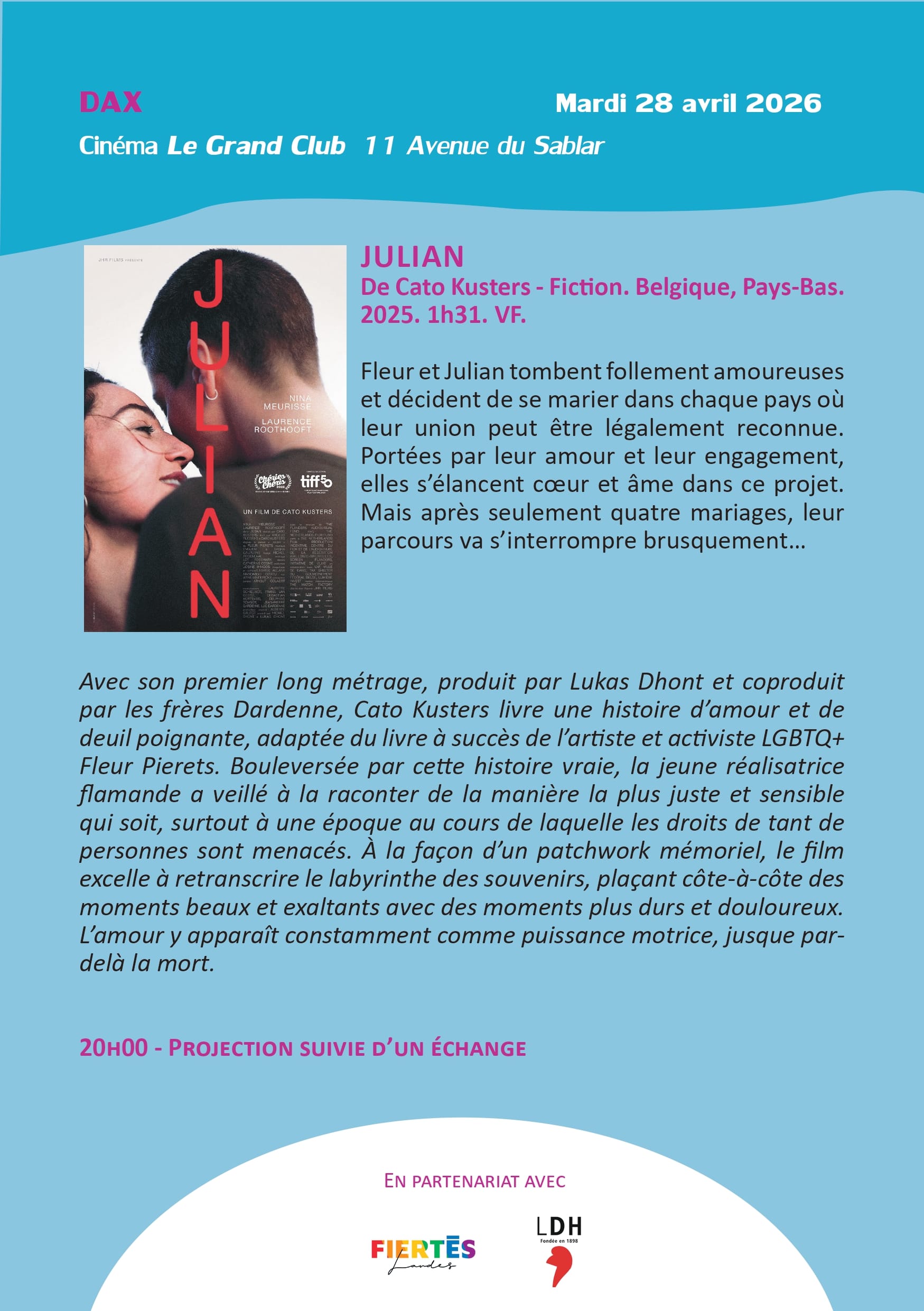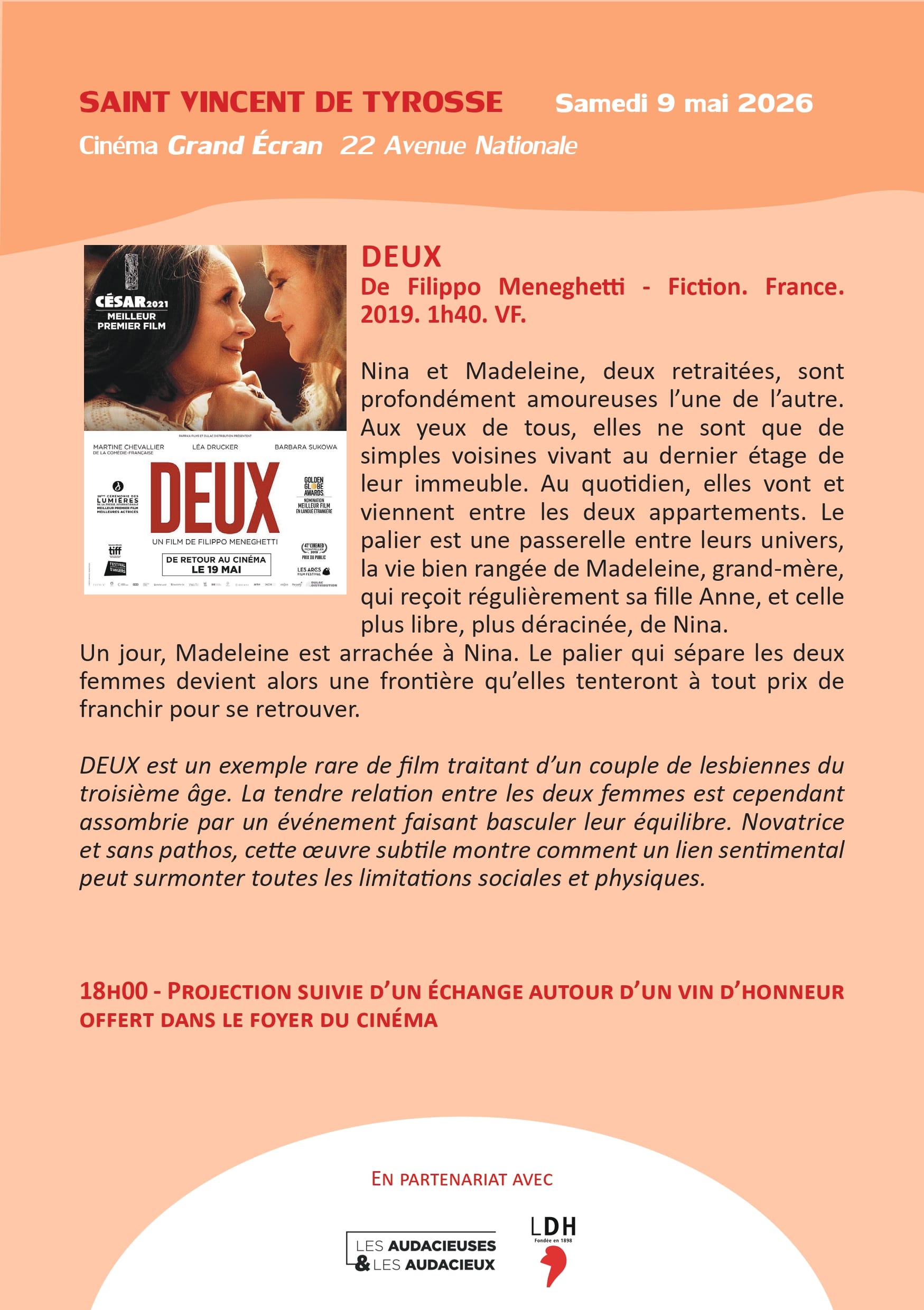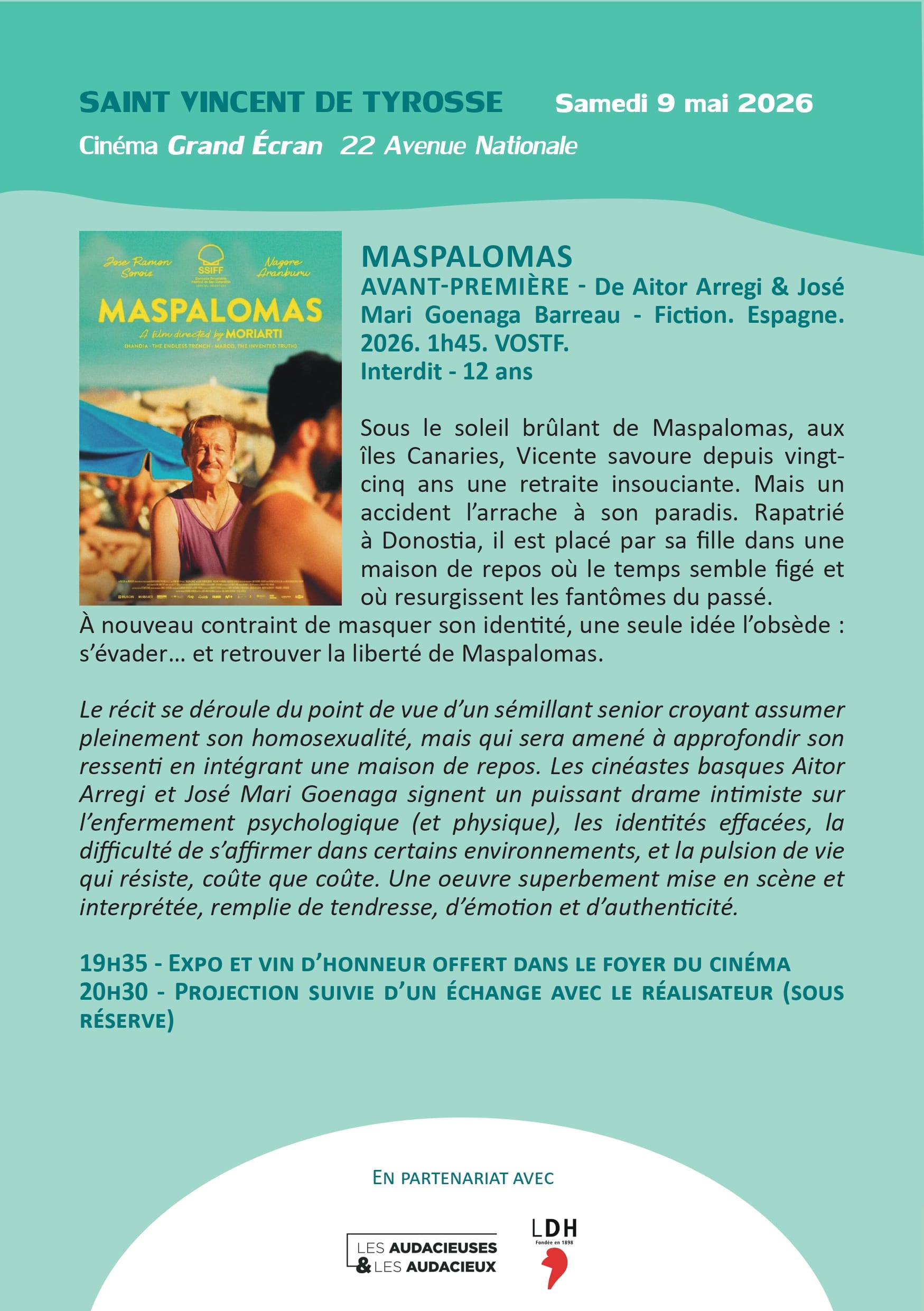 SAINT VINCENT DE TYROSSE – Cinéma Grand Écran 22 Avenue Nationale Samedi 9 mai à 18h Projection suivie d’un échange autour d’un vin d’honneur offert…