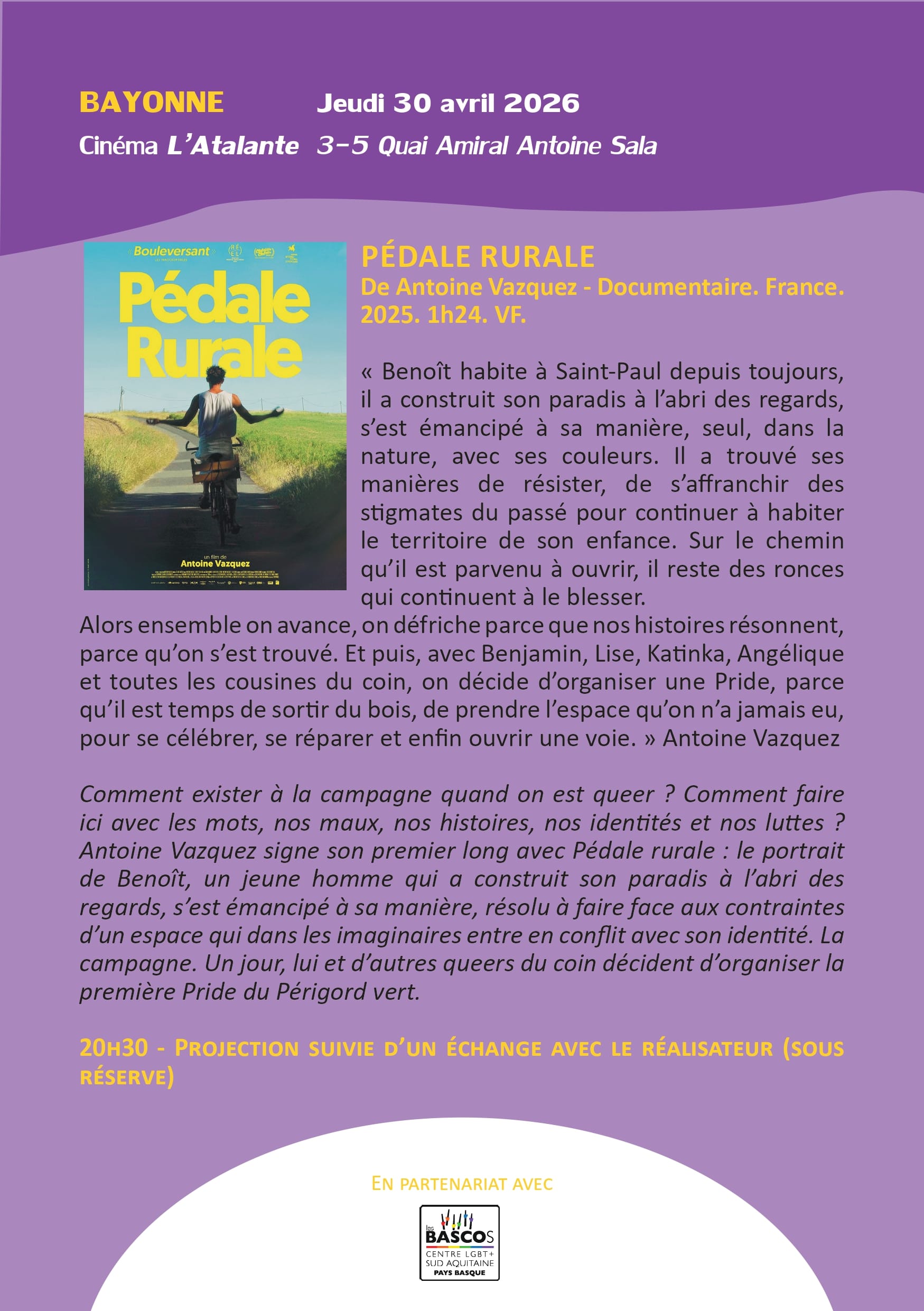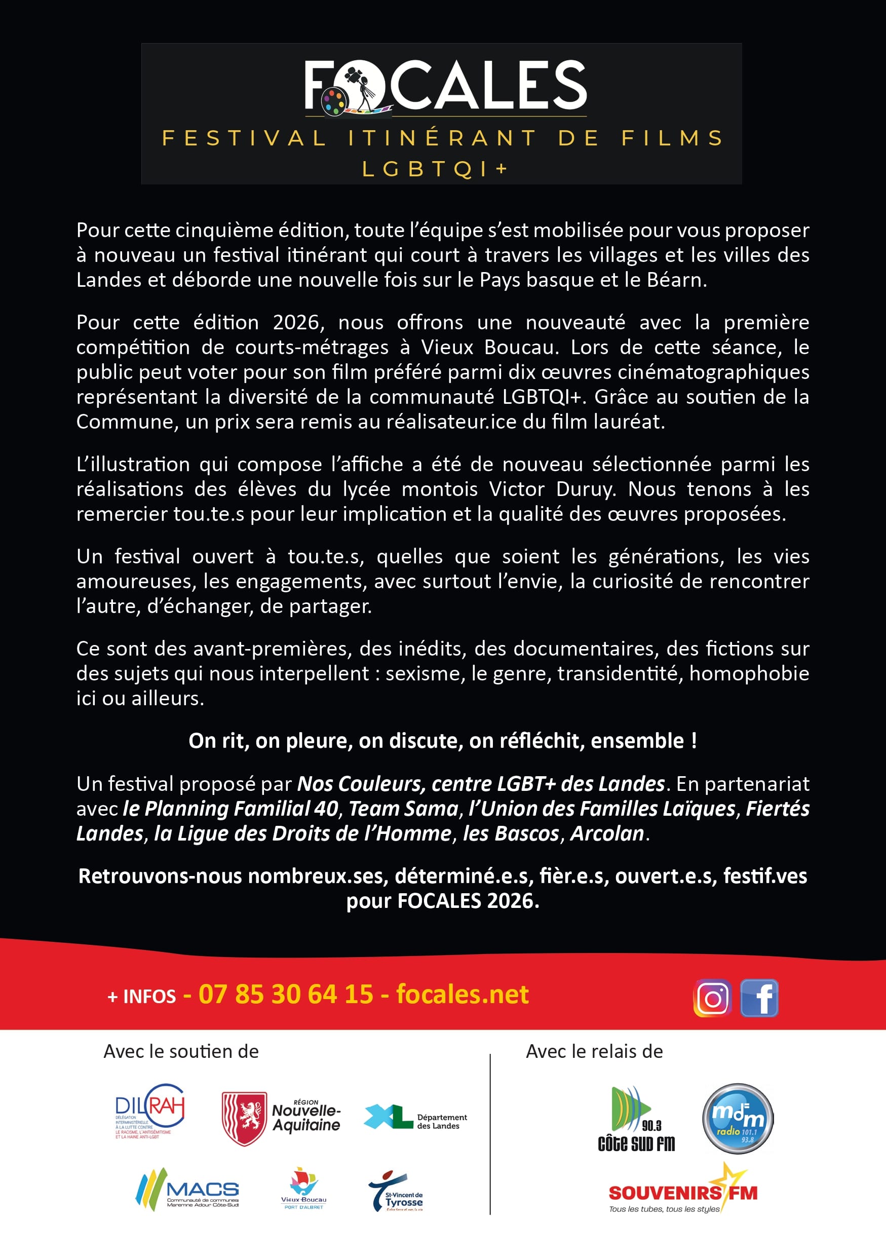 Notre territoire (Landes, Béarn & Pays basque) est marqué par la ruralité, avec de petites et moyennes villes qui rendent plus difficile la visibilité de la communauté LGBTQI+ et de ses problématiques. Pour ces raisons, dès 2022, l’association Nos Couleurs fait le choix d’organiser une action itinérante sous la forme d’un festival du film LGBTQI+. L’objectif est de s’appuyer sur la dimension culturelle et populaire du cinéma pour sensibiliser un public large, notamment les jeunes et leurs familles, contre les discriminations LGBTphobes