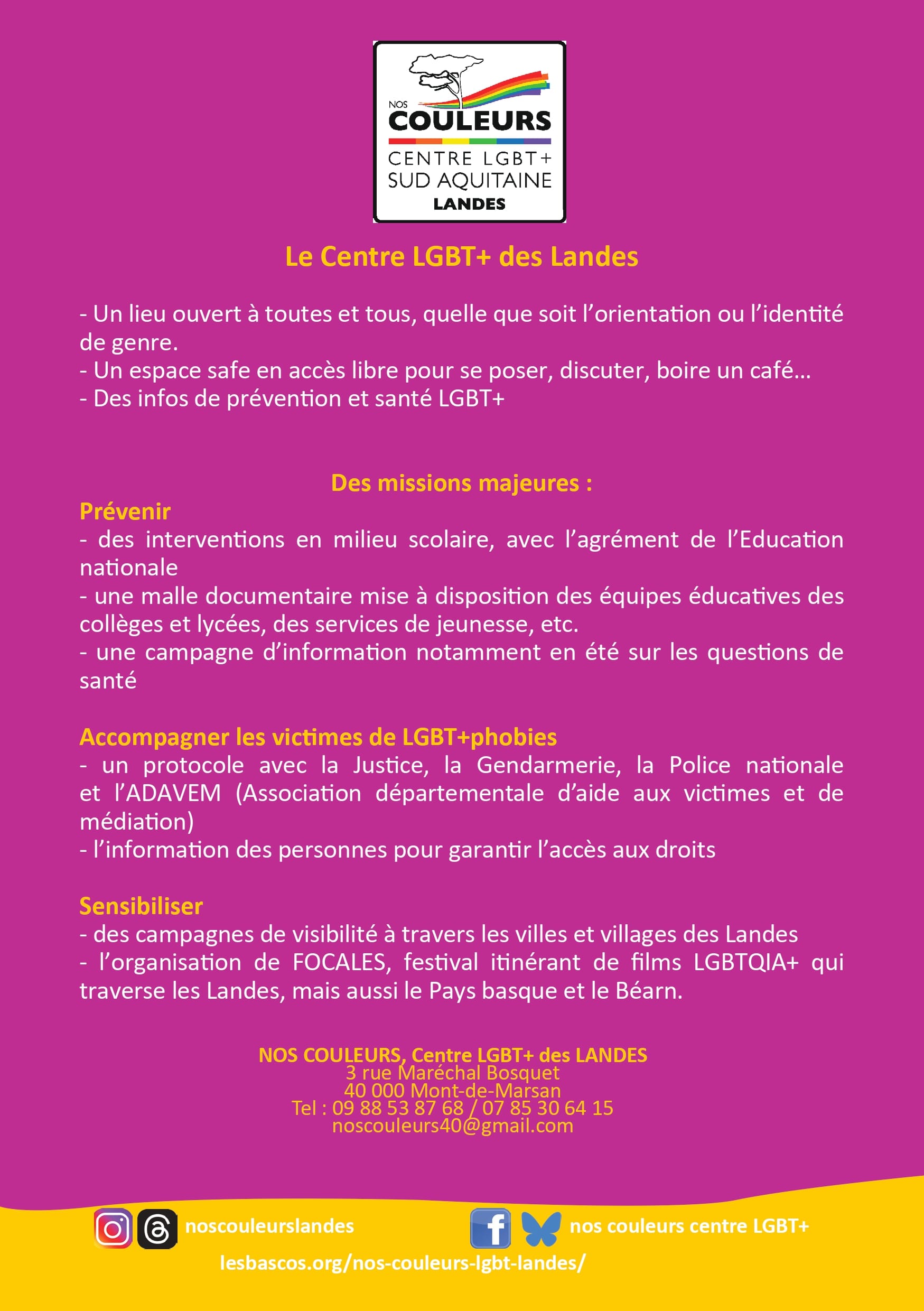 L’association est le Centre LGBT+ des Landes. Elle a pour but de développer des actions conviviales, culturelles, sportives, sociales, militantes et préventives en faveur des personnes LGBTQIA+ et leurs allié.e.s.